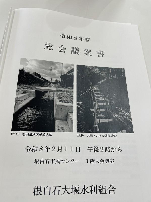 根白石大堰水利組合の令和8年度総会に来賓としてご挨拶 集中豪雨や台風時の洪水・側溝被害への備え、担い手不足や高齢化など、現場ならではの切実な声をいただく いただいたご意見を踏まえ、市の新規事業や拡充策について丁寧にご説明。 地域の大切な水利・農業基盤を守る現場の声を政策に反映