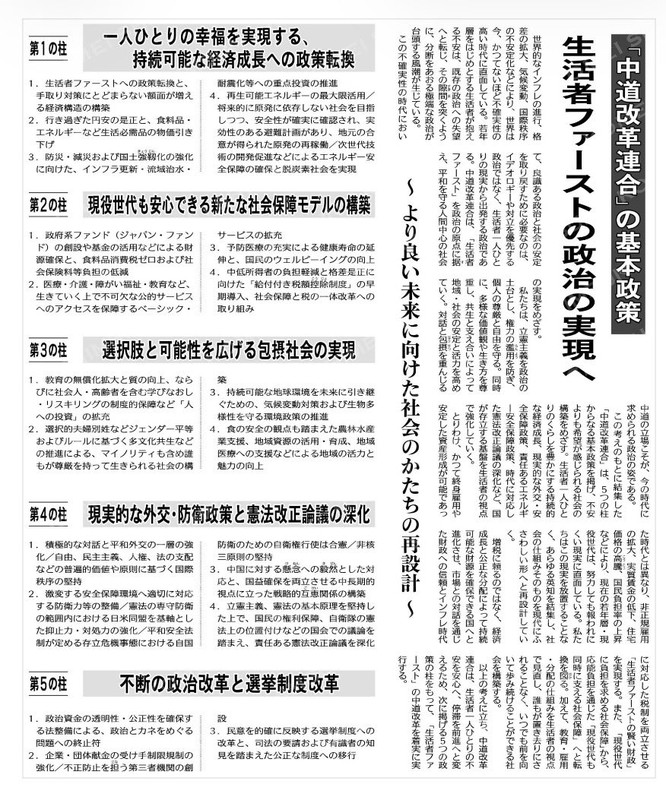 「頑張っても報われない」不安を希望に変えたい‼ 世界的なインフレや格差の拡大。今、政治に求められているのはイデオロギーの対立ではなく、くらしから出発する政治です‼ 中道は、「生活者ファースト」を掲げ、5つの柱で日本を再設計します‼