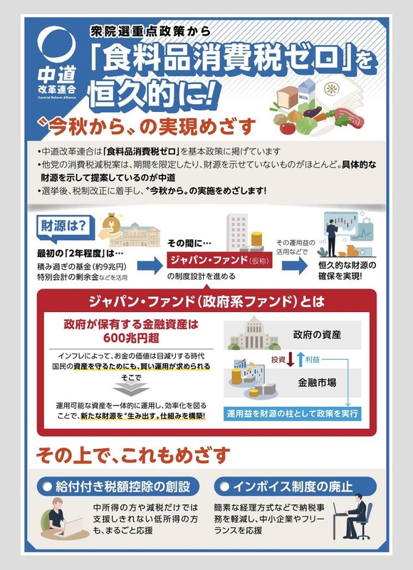 ① 食料品の消費税を恒久ゼロ ・2026年秋からずっとゼロ ・財源は政府系ファンドの運用益など ・国債に頼らない持続可能な減税 ② 現役世代の社会保険料を軽く ・社会保険料の引き下げを掲げる ③ 生活者ファーストの物価対策 ・家賃補助