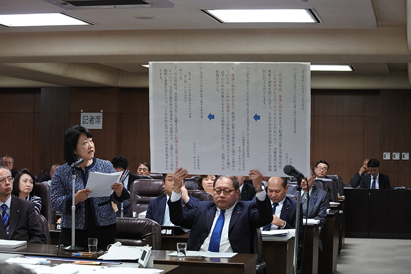 教育費中、「いじめ防止対策事業」について質疑を行いました。「子どもをいじめから守るための対策ハンドブック」の「事案認知後の流れ」には、「仲直りの会」が設定されているが、その在り方はマニアルにあるからやらなければならないという意識にならないように教師自身の判断で行えるよう活用するところを求めました。更には、教師等の発達に特性を持つ児童生徒への理解について、相談が多数寄せられている現状を問い、対策には研修はもちろんのこと、その責任を教師のみに押し付けるのではなく、学校、教育委員会等強いては仙台市として公的第三者機関の相談窓口を早急に講じるところを求めました。