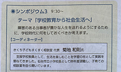 私は、シンポジウム3「学校教育から社会へ」に参加。子どものこころの発達医学教室、本田教授のお話をお聞きしました。NPO法人を設立し発達障がい者支援事業を行い、人生を楽しむプログラムを提供されていることや、二次障がいに対する考え方など、目からうろこのお話に驚きと納得の連続で、今後の教授の指導等の情報発信に仙台市の教育・学校関係者がこれまで以上に注目し、支援や療育に実践していただくところを願うばかりです。